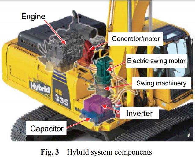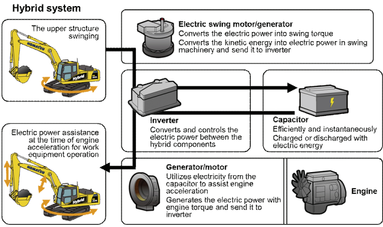 (They charge the capacitor when the swing structure uses the swing brake during deceleration. Swing operation is the rotation of upper body about vertical axis, as shown in the first figure. )